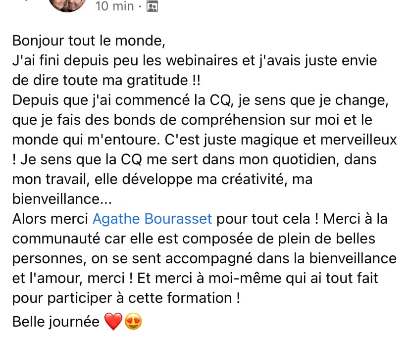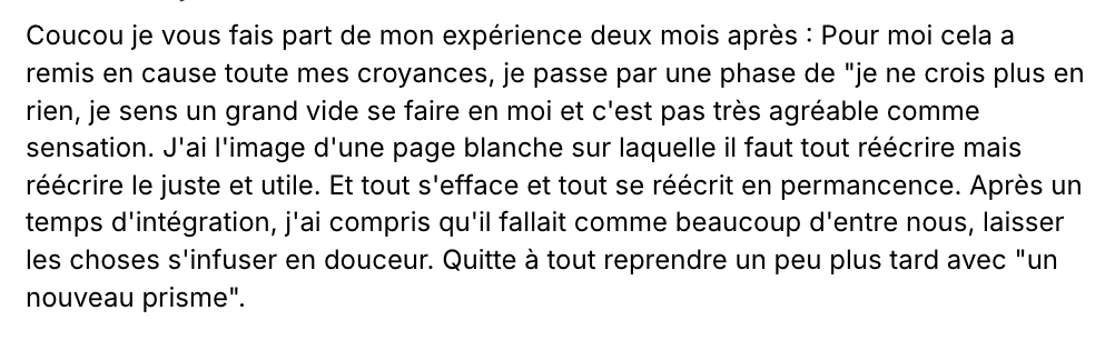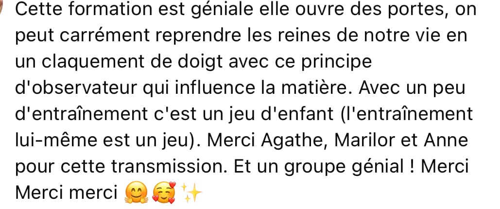 Plus de 70% de nos stagiaires indiquent un changement profond de leur quotidien, de leur pratique, leurs relations familiales et amicales : c'est du jamais vu ! Pour les 30% restants, tous nous ont dit avoir amélioré leur pratique vers plus de conscience, une gestion des informations beaucoup plus fine et efficace, et une appréciation plus justes de leurs relations. Le point différenciant ayant été l'accompagnement soutenu, les réponses personnalisées aux questions et les pairs pour faire des échanges réguliers en co-vision ou personnelle. Cette opportunité d'échanges est un atout considérable pour fluidifier les relations et expériences avant même qu'elles ne s'enkystent et cristallisent.